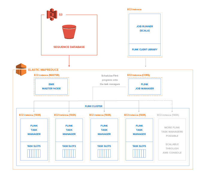 At XAOP, we have used Flink to develop a highly distributed pipeline for the calculation of pairwise protein sequence alignments. We chose Flink because it is an interesting new technology, which has recently been gaining traction. Its first fully stable version 1.0 was released earlier this year (March 2016). It provided a fitting solution to our problem and integrates seamlessly with most Amazon Web Services. Since Flink can run on a Hadoop YARN cluster, it’s also possible to run it on Amazon EMR, allowing us to minimize the deployment effort and fully virtualize our processing resources. This approach also significantly reduces EC2 (Elastic Compute Cloud) costs, since most of the calculations can be offloaded to much cheaper EC2 spot instances.