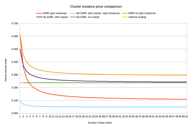 In one of our earlier posts, we mentioned that the cost difference between vertical and horizontal scaling for on-demand instances is negligible. However, the same principle does not hold when using spot instances. While bare EC2 spot instances induce a considerable maintenance effort, using spot instances with Amazon EMR is exceedingly simple. For our EMR cluster, we need a master and a core instance to meet the minimum cluster requirements, but after that we can easily scale horizontally using very cheap spot instances straight from the AWS console (we don’t need HDFS persistence for our calculations). Unfortunately, as of the writing of this post, this does require a restart of the Flink cluster as well. For us this is currently not a deal-breaker because the spot market price for the instances we are using does not fluctuate heavily. However, if you want to make proper use of the flexibility of EC2 spot instances, this is definitely a missing feature. YARN hosted autoscaling is listed on Flink’s roadmap for 2016, so we do expect this problem to be addressed by the Flink development team relatively soon.